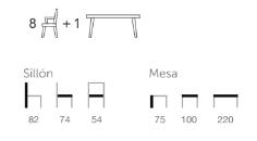 y 8 sillones con armazón de aluminio y cojines tapizados según imagen.